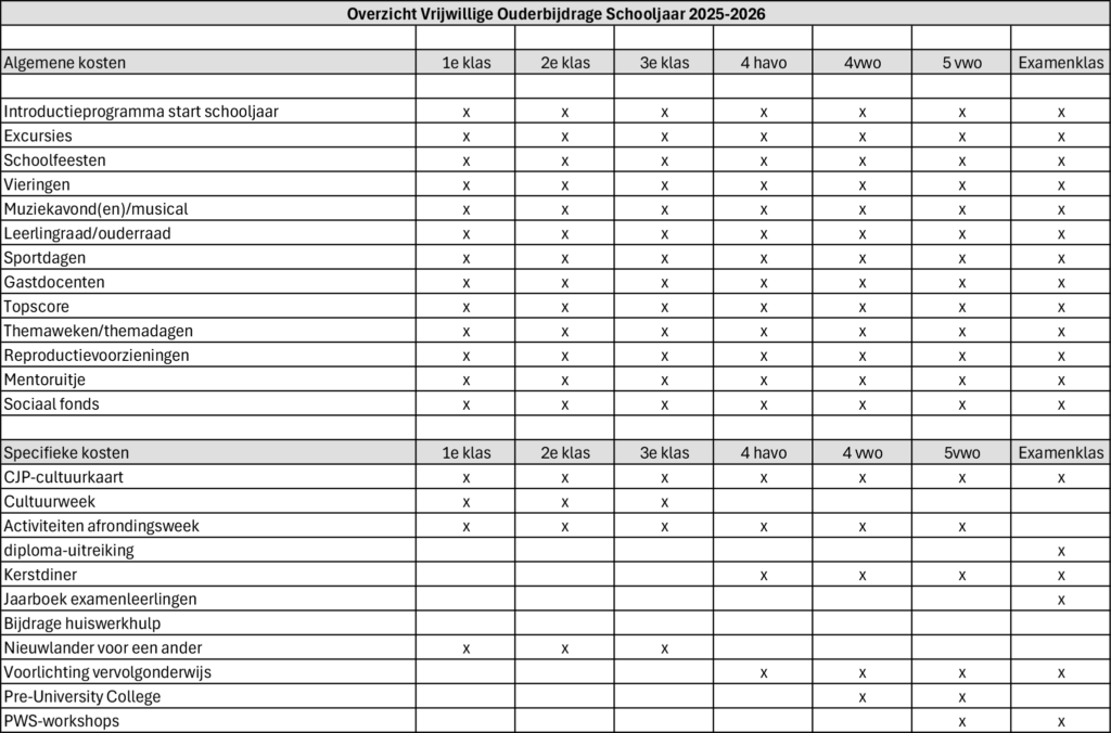 Er zijn ook ouders die meer willen betalen dan het bedrag van de ouderbijdrage. Dit stellen wij zeer op prijs! Hierover ontvangt u aan het begin van het schooljaar meer informatie.